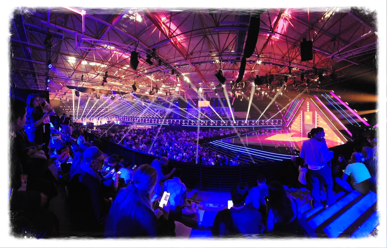 En esta edición, el escenario presenta dos accesos laterales con amplias escaleras, mientras que el vértice del triángulo apunta directamente hacia el público. En la parte frontal, una estructura que abarca casi todo el ancho del pabellón alberga una impactante pantalla vertical, también de forma triangular, ubicada en el centro.